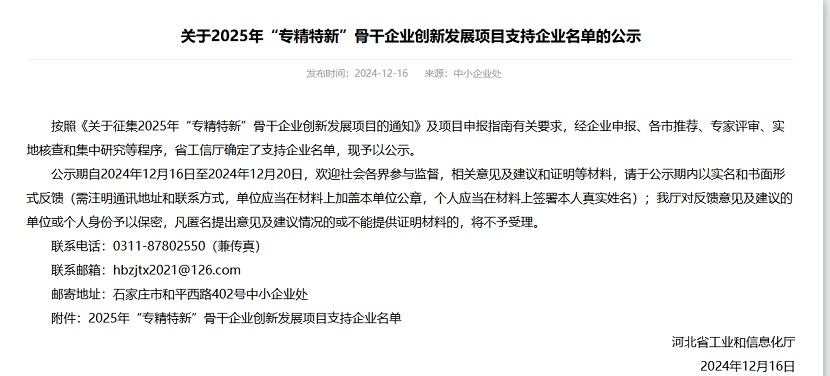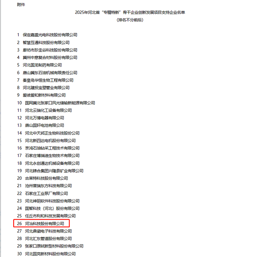 近日,公司憑借在專業(yè)領域內(nèi)的持續(xù)深耕與創(chuàng)新,再度榮獲河北省“專精特新”示范企業(yè)認定。這一榮譽的再次獲得,不僅是對公司長期以來堅持專業(yè)化、精細化、特色化、新穎化發(fā)展道路的肯定,更是對公司不斷創(chuàng)新、追求卓越精神的認可。